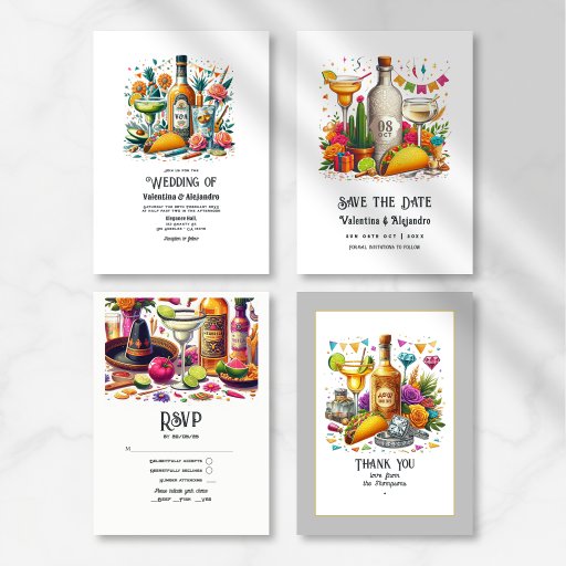 Comemore em estilo com este vibrante convite à Festa de solteira Fiesta, com uma ilustração animada de tacos e tequila margarita. As iniciais da bachelorette no rótulo do frasco acrescentam um toque personalizado, fazer-o como uma marca única para a ocasião. Com sotaques lúdicos inspirados em fiesta, essa design captura perfeitamente o espírito divertido e festivo do evento.