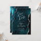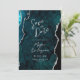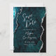Este elegante cartão de save the date de casamento apresenta uma imagem de fundo de ágata em aquarela azul-teal aparada com brilho de prata falsa. O texto personalizável combina escrita moderna prateada, copperplate e fontes itálicas. O verso apresenta um design de ágata teal e prata coordenado.