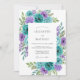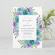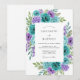 This design features a vibrant arrangement of watercolor florals in a rich palette of teal, aqua, and purple. Elegant teal roses and deep violet roses are nestled among delicate clusters of blue and lavender hydrangeas. Lush green leaves and sprigs of eucalyptus add a fresh, organic feel to the artwork. The contrast between the cool jewel tones and the clean background creates a romantic atmosphere for a spring or summer event.