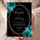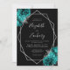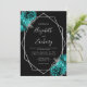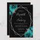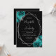 This elegant modern wedding invitation features a silver geometric frame decorated with teal and silver floral bouquets on a black background. The customizable text combines silver gray whimsical handwriting, copperplate and italic fonts. The reverse side is solid black.