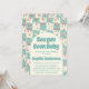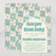 Celebrate your little one on the way with this charming pastel beach-themed baby shower invitation. Featuring a soft teal checkerboard background adorned with delicate seashells, bows, and ocean-inspired illustrations, this design creates a sweet and calming coastal vibe.