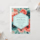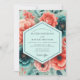 A dramatic and artistic design featuring a lush arrangement of painterly botanicals. A bold color palette contrasts deep teal and turquoise hues with vibrant shades of coral and salmon pink. Detailed roses and peonies create a romantic yet modern atmosphere for your special day.