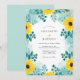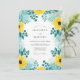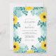 This design features a bright watercolor aesthetic perfect for a sunny outdoor ceremony. A vibrant palette of golden yellow and deep teal creates a striking contrast against the crisp white. Radiant sunflowers are nestled among lush eucalyptus leaves and delicate botanical sprigs in a lush arrangement. The airy watercolor washes add a soft, artistic touch to the floral composition.