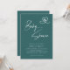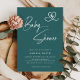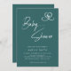 This modern baby shower invitation features elegant hand-lettered script on a soft muted teal background with a sweet heart footprint accent. The back design includes space for a photo or additional details, creating a timeless and personal way to invite loved ones to celebrate your growing family.