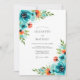 This design features a vibrant watercolor palette of teal blue and fiery orange. Large hand-painted roses in turquoise tones are accented by delicate coral anemones and lush green foliage. The artistic style creates a fresh and spirited mood for any warm-weather event. These botanical clusters provide a striking contrast against the clean white aesthetic.
