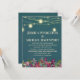 Convite de casamento com um fundo teal ousado e flores roxas de ameixa com luzes de cordas brilhantes e frascos-pedras.