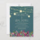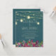 Convite de casamento com um fundo teal ousado e flores roxas de ameixa com luzes de cordas brilhantes e frascos-pedras.