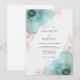 This design showcases fluid teal watercolor ink blooms paired with delicate rose gold metallic line-art illustrations. The artistic style creates an ethereal and sophisticated mood, perfect for a modern seasonal event. Elegant roses and botanical elements weave through the splashes of color, creating a luminous and airy aesthetic. The palette blends deep aqua tones with warm metallic accents.