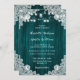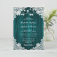 Convite de casamento teal russo com madeira de celeiro adornada com rendas florais brancas e luzes de cordas. Design de cartão perfeito para convidar seus hóspedes para o seu país rústico ou festa de casamento de celeiro.