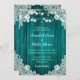 Romantic teal rustic chic wedding invitation featuring white floral lace and string lights on a wood background. Perfect card design for inviting your guests to your romantic rustic teal wedding party.