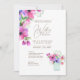Convite de casamento moderno com belos gráficos florais e campos de modelo de texto para ambos os lados para adicionar todos os seus detalhes incluindo cerimônia de casamento, recepção, rsvp, registro de presentes e muito mais. Edite o código de varredura qr com a URL do seu próprio site de casamento ou remova-o se não for necessário.