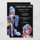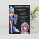 Um homem alto e vivaz vestido de arrastar está vestindo um lindo vestido azul brilhante e cintilante e uma pulseira de penas. Ele está vestindo uma peruca de cinza prateada em grande volume e longos braceletes de rocha pendura com uma pulseira de diamante. Ambas as mãos são colocadas em suas ancas. Uma segunda rainha do arrasto aparece no canto inferior direito vestindo um chapéu de pena vermelho e azul. Modelos de texto branco editáveis aparecem à sua direita, contra um fundo preto, e podem ser personalizados para se adequarem à sua celebração festiva. O verso tem um terceiro homossexual e um texto extra para outras informações que você pode precisar que seus convidados conheçam. Simplesmente apague o texto se não for necessário. Este design de aquarela luxuosa, elegante e de alto mercado é ideal para uma festa, carnaval, rainha do arrasto, lgbtq, gay ou celebração de circo, seja uma festa de aposentadoria, aniversário, halloween ou uma festa de janto de sentar. Este é adequado para adultos