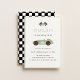 Convite de aniversário tema Carro de Corrida Retro. Ilustração de Carro de Corrida Verde Sage e fundo com padrão de xadrez.