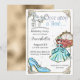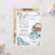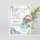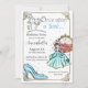 Esse convite de festas mágico e encantador apresenta um tema ilustrado de conto de fadas da Cinderela. A frase clássica de conto de fadas Uma vez em um tempo é impressa no topo em um padrão de brilho gradiente. Várias imagens de desenhos animados da história são fotografadas ao redor da fronteira. Um quadro de estilo vintage borda o convite para lhe dar uma aparência antiga de um livro de histórias. Um cavalo e um rato são imagens no topo à esquerda. Cinderela é fotografada no centro, perto de um antigo relógio de ouro. Coloca-se um escorregador de vidro azul grande na parte inferior esquerda.
