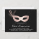 Os convites elegantes de mascarada para a celebração da quinceanera contêm uma máscara de penas em folha de ouro falso de rosa num fundo preto rico. Personalize com os detalhes do seu partido abaixo em um script de caligrafia branca e em caracteres modernos de blocos.
