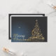 O cartão de Natal apresenta uma elegante árvore de Natal ouro feita de estrelas cintilantes sobre um fundo azul escuro. A inscrição "Feliz Natal" no ouro, a letra curvada circula estilhosamente do design festivo. 🎄 ✨