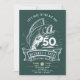 50º aniversário de ideias para os homens: uma pesca temida pelo 50º convite de aniversário, com o número 50 em letras grandes e ousadas e um desenho de linha de um peixe saltando da água. Esquema de cor verde-azul-aqua e amarelo-ouro. Um moderno e elegante convite de aniversário 50º para o seu marido, namorado, parceiro, avô, tio etc.