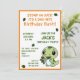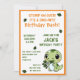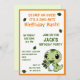 Um convite de aniversário de criança giro e engraçado com um dinossauro verde. É uma escolha excelente para uma criança que ama dinossauros especialmente meninos. o bebê dinossauro está comendo folhas e a design está decorada com algumas folhas. a design tem uma borda laranja.