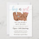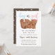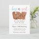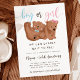 O gênero com tema de ursos bonitos revela convite de festas com ilustração de filhotes com arco rosa e gravata de arco azul. O texto diz "menino ou menina? podemos esperar para ver!"
