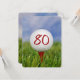 Feche uma bola branca de golfe sobre uma teta vermelha na grama para o convite de aniversário de 80.