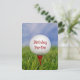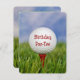 Feche uma bola branca de golfe sobre uma teta vermelha na grama para convite de aniversário. Pode ser utilizado em qualquer idade.