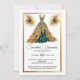 Um lindo vestido esmeralda verde-água e ouro da bola Quinceañera é enfeitado com penas vibrantes de pavão de ouro e é enquadrado por uma falsa borda retangular de ouro. Duas penas individuais aparecem no canto superior direito e no canto superior esquerdo da armação apontando em direção ao vestido elegante. Abaixo do vestido estão modelos pretos para sua redação personalizada. Esta design moderna, moderna e dinâmica é ideal para uma Quinceañera; aniversário; casamento ou chá de panela.