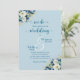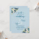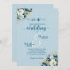 Um convite de casamento elegante com flores poeirentas de ouro azul e flores elegantes e caligrafia elegante que você pode personalizar com seus detalhes.