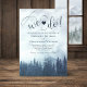 Este convite para o casamento é rústico, romântico e bonito. Apresenta um elegante design com uma paisagem de natureza selvagem ao ar livre, coberta de pinheiros azuis e envolta em neblina ou neblina. A legenda diz: "Nós fazemos!" em letras modernas, com um coração bonito entre as palavras. A parte de trás é uma cor indigo marmoreada. Perfeito para um casamento de destino de montanha, ou qualquer coisa com um sentimento de serra.