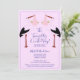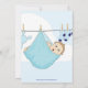 Cegonete branco segurando feixes de bebês bichos rosa e gêmeos em um convite de chá de fraldas para meninas. Personalize com as informações e o local do evento. Típica fofinha em azul. Grande pacote de bebês no lado inverso do convite!