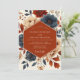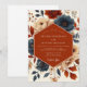 This design features a rich tapestry of deep terracotta, muted blues, and soft cream blooms. The arrangement evokes an autumnal romance with botanical elements and a warm, inviting aesthetic. Hints of deeper rust and subtle foliage add depth and texture to the composition.