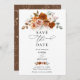 Elegant terracotta and burnt orange floral Save the Date card featuring watercolor roses and warm autumn botanical details.
