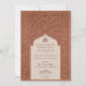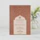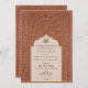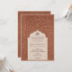 Este belo convite para o casamento é um testemunho do esplendor da arte tradicional islâmica, apresentando uma cor quente de terracota que exumenta um encanto rústico. O elaborado padrão de rendas, com suas florais entrelaçadas e designs arabescos, enfeita tanto a frente como o verso do convite, capturando o olho com sua profundidade e elegância. Na frente, a janela arcaica central é cercada por uma densa espessura de motivos botânicos, moldando os detalhes essenciais do casamento em uma fonte clássica. O verso do convite é igualmente impressionante, com espaço reservado para versos significativos ou texto personalizado, colocado no pano de fundo do mesmo design rico e ornamentado. Este convite não só anuncia o seu dia especial, como também homenageia a rica herança cultural incorporada nas tradições artísticas islâmicas.