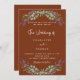 Um pano de fundo de cor tendenciosa, de terracota, decorado com flores de lavanda e verde de eucalipto. Personalize e seus nomes e detalhes.