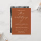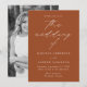 Convite de casamento minimalista e moderno, com detalhes de seu casamento em letras brancas simples com "o casamento de" em um roteiro elegante de caligrafia com fundo de terracota. O convite reverte para exibir sua foto de noivado vertical. Projetado para coordenar com a nossa coleção de casamento do Modern Elegance.