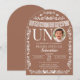 Celebrate your little one turning ONE with this elegant terracotta “UNO” photo birthday invitation. Inspired by traditional Mexican papel picado décor, this design features delicate white banner details and ornamental flourishes set against a warm terracotta background.