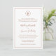Simples Convite de Casamento com seu monograma em um círculo no topo e seus detalhes de casamento cercados por uma fina fronteira. Seus nomes estão em uma fonte elegante de script manuscrito. Todos os elementos de design são tons de terracota/laranja queimado/terra de ferrugem sobre um fundo branco e podem ser alterados na ferramenta de edição de design. O esquema clássico e tradicional faz este excelente de convite para um casamento formal.