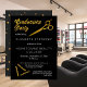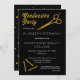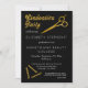 Festa de formatura negra e dourada para a festa de formando da escola de beleza. A frente apresenta tesouras e pinos de cabelo do ouro junto com o texto, "Festa de formatura" como parte do design, e a parte traseira apresenta um fundo preto e dourado com bolinhas confetti em tamanhos variados. Simplesmente personalize a frente com os detalhes do seu partido e adicione ao carrinho. Design por Holiday Hearts Design (direitos reservados).