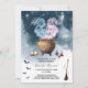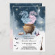 Uma magia e assustadora, temático Bebê Gênero, revela modelo Convite de festas. Num fundo azul estrelado do céu, uma caldeirada de bruxas cercada por poções, morcegos e vassouras é vista a fazer fumaça azul e rosa. O texto da tipografia diz Ele ou ela, bruxa está se preparando? Personalize editando o convite digital ou impresso com os detalhes do evento.