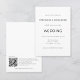 Texto Simples Apenas Código QR Casamento Branco Preto. A cor e o tipo da fonte podem ser alterados através do menu de edição. Você também pode alterar as cores do texto e do plano de fundo em ambos os lados, se desejar. Adicione seu código QR ao seu site de casamento no verso como uma opção conveniente para seus convidados para RSVP. Os códigos QR podem ser criados gratuitamente on-line. Basta pesquisar "Criador de código QR" e selecionar um dos criadores livres. Você também pode remover o código QR se desejar.
