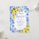 The back of the invitation continues the blue tile and watercolor lemon floral design, creating a cohesive and polished stationery set. Easily personalize with your event details to create a memorable and beautifully styled bridal shower invitation.