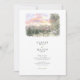 This two-sided wedding invitation features a charming watercolor illustration of a The Pallet Barn nestled in lush Christmas trees. Loose ink outlines define the wooden structure, while soft washes of evergreen, sepia, and muted gold capture the texture of the trees and the surrounding landscape. On the front, a scenic country lane lined with fencing leads the eye toward the barn under a dreamy pastel sunset sky, creating a romantic sense of arrival and place.