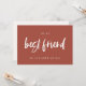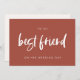 Um simples e minimalista cartão de presente para escrever uma mensagem pessoal e sincera para sua melhor amiga no dia do casamento dela. Totalmente personalizável com suas cores favoritas. Você pode adicionar uma mensagem no verso ou deixá-lo em branco se preferir escrever sua mensagem à mão posteriormente.