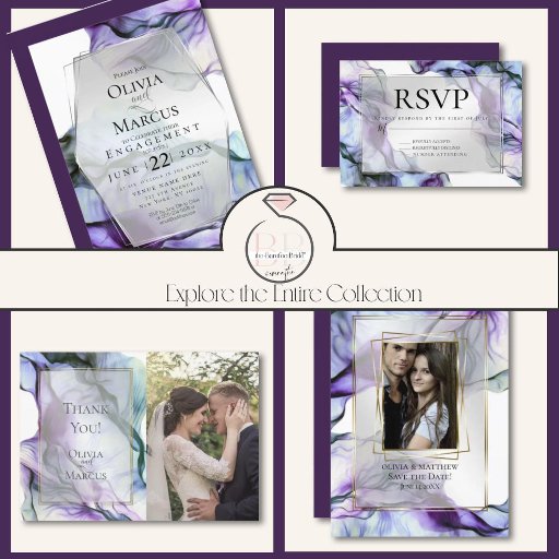 Adicione sua foto a este abstrato ultra moderno Salve a data. As espirais fluidas de tinta de abstrato fluido aparecem como fumaça ou vapor de cor intensa - em tons de roxo ultra violeta, índigo e lacrimejo. Sobreposição de quadro prateado com preenchimento de enfumaçado translúcido é onde seus detalhes são colocados. Este é um design abstrato exclusivo criado para o BarefootBride™ por © WhimsicalArtwork™ Personalize texto, estilo de fonte, cor e tamanho. Criamos que esta modelo é para facilitar a personalização com suas próprias informações. Esta é parte de uma suíte de artigos de casamento