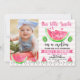 Lixado cor-de-rosa Um em um belo convite para primeiro aniversario de fotografia de Melon Rapariga em um primeiro convite de aniversário de fotografia de melão com uma fatia de melancia grande, texto caligrafia de pincel de aquarela, pontos pretos, faixa rosa e um plano de fundo listrado cor-de-rosa.