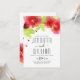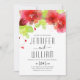 Tipografia moderna e convite floral de flores vermelhas. Mostra um buquê de flores vermelhas e cor-de-rosa com folhas verdes, seus nomes no estilo da tipografia moderna e seu texto.