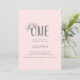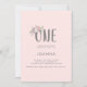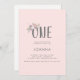 Um primeiro convite de aniversário moderno para sua garotinha de cor-de-rosa pincelada apresentando "um" em cinza com letra escrita em pincel decorada com flores de cor-de-água. Ao contrário, há um padrão de bolinhas cor-de-rosa pinceladas.