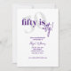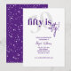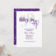 Tipografia negrito com caligrafia 50 é um convite de aniversário festivo elegante em roxo e branco. O verso apresenta um fundo totalmente roxo com manchas/brilhos brancos para imitar as bolhas no vinho e champanhe para celebrar como envelhecemos como um vinho fino. Todo o texto é completamente personalizável.