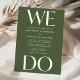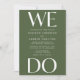 Aumente a expectativa do seu dia especial com o nosso convite de casamento moderno "We Do" - uma impressionante combinação de letras brancas em negrito contra um fundo verde oliva. Posicionada no topo e na parte inferior, a frase "We Do" faz uma declaração visual poderosa, simbolizando a sua união. A beleza está na personalização no centro, onde você pode adicionar seus nomes e detalhes do casamento, tornando este convite exclusivamente seu. Escolha entre convites impressos de alta qualidade, uma opção de download instantâneo para acessibilidade imediata, ou opte por ambos para desfrutar do melhor dos dois mundos. Faça uma declaração com estilo e prepare o cenário para a sua história de amor - compre o convite "We Do" agora e comece sua jornada em direção a um começo lindamente elaborado.