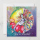 Colorida, caprichosa fada sentada em uma flor vermelha em brilhos dourados e cores vibrantes. Pintura acrílica com folha dourada e prateada com cores iridescentes.