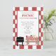 Ótimo convite para piqueniques ou uma reunião de churrasco. O convite tem uma churrasqueira a gás e mesa de piquenique cheia de hambúrgueres, cachorros quentes, copo de vinho, copo vermelho e canudo, limonada e uma melancia. Personalize sua mensagem para a ocasião.